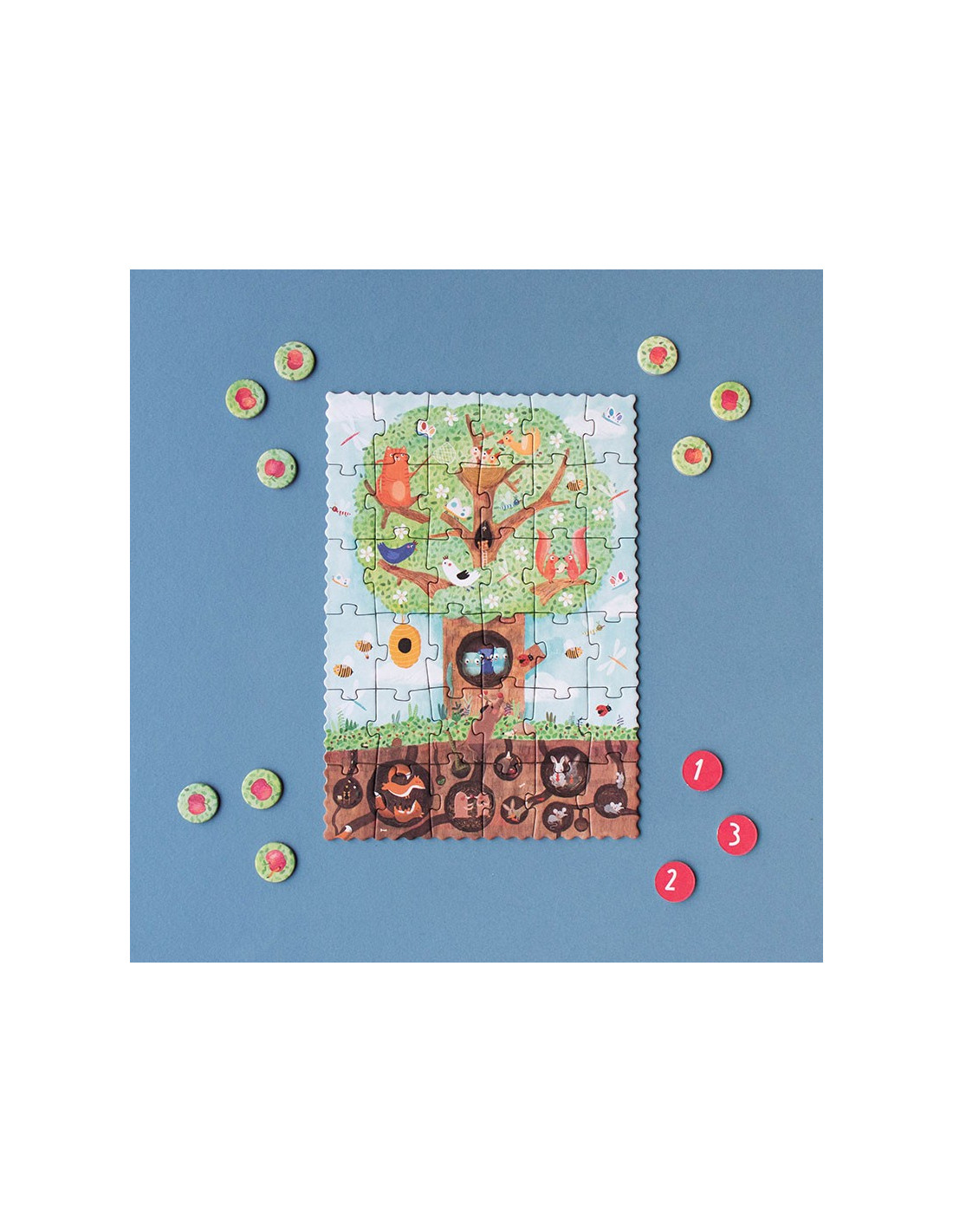 Ce joli puzzle illustré par Txell Darné contient 36 pièces représentant un pommier et ses habitants au printemps en petit format très pratique. Une fois le puzzle assemblé, l'enfant peut s'adonner à un petit jeu d'observation avec 12 jetons numérotés à placer sur l'arbre.